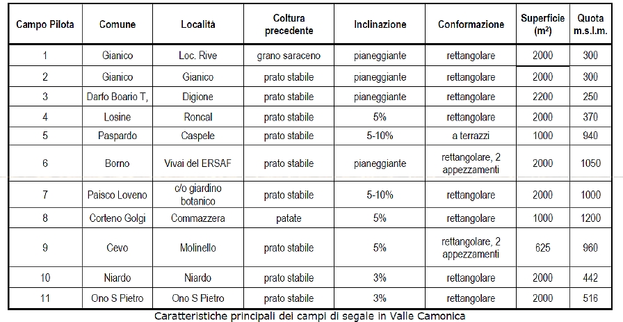 Tab. 2 - Caratteristiche campi sperimentali Valle Camonica