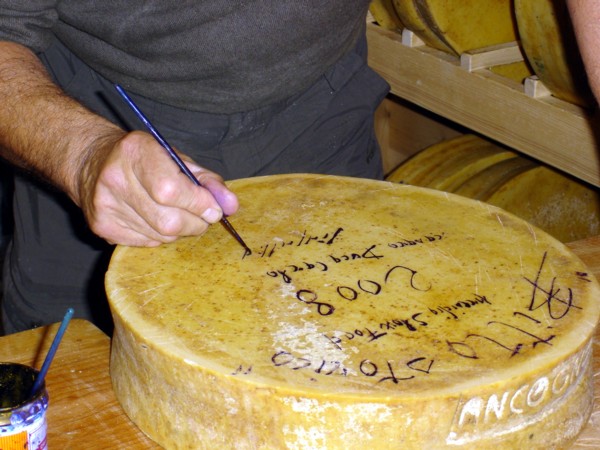 Le foto (alla buona, non avevo nemmeno dietro la reflex) ritraggono Ciapparelli che autografa le forme. Una prassi di "autenticazione" che è stata introdotta dopo Cheese, ovvero dopo la constatazione che il Bitto storico - sempre più celebrato - deve divenire facilmente distinguibile, inimitabile. Paolo Ciapparelli si è fatto esperto calligrafo e verga a mano, una ad una le forme riportando l'indicazione del casaro, dell'annata, dell'alpeggio e alla fine apponendo la sua firma. Dal Santuario del Bitto d'ora in poi le forme usciranno solo con l'autenticazione.