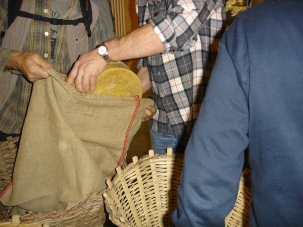 Le forme vengono insaccate e deposte tra strati di fieno. Operazioni dal sapore antico anche se una volta il carico doveva essere molto maggiore. Non una ma quattro o più forme.
